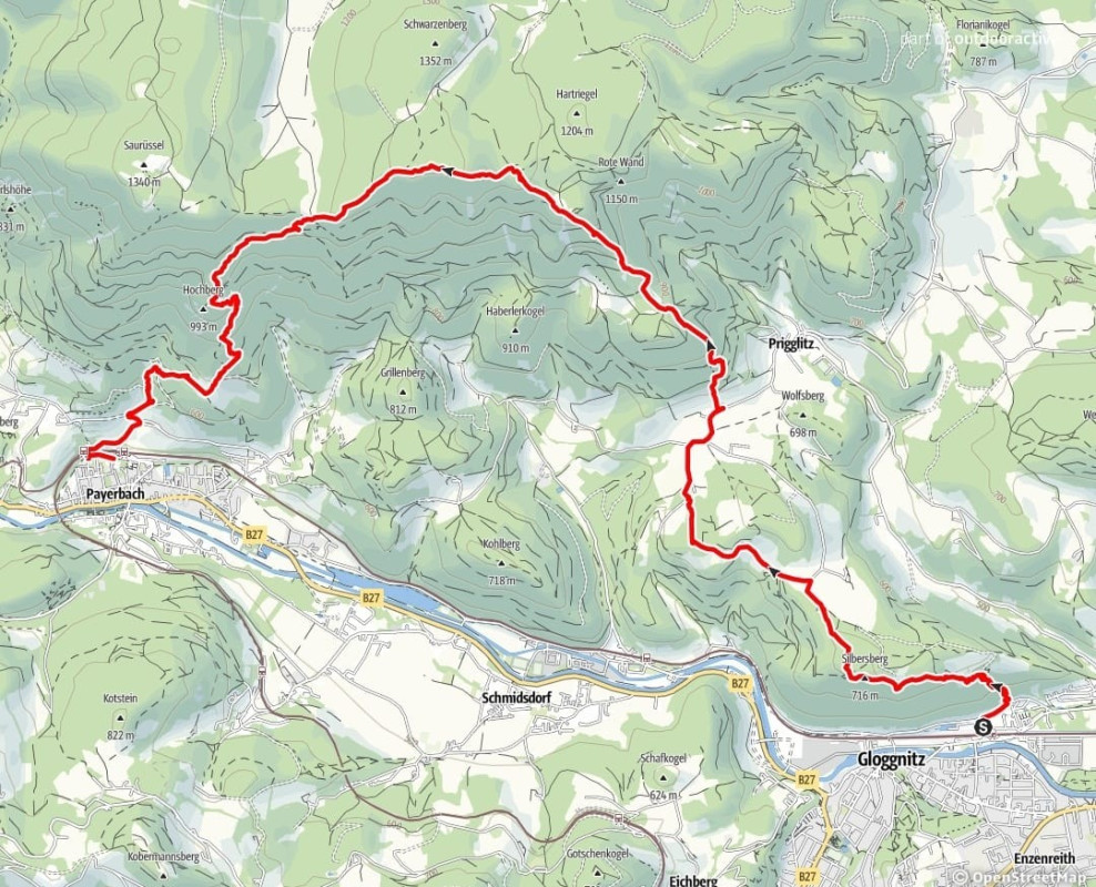 Unsere Wanderung verläuft von Gloggnitz über den Silbersberg und den Schwarzenberg nach Payerbach!